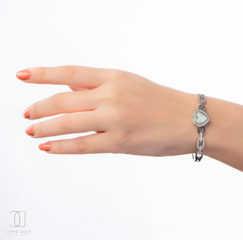 Description: A silver bracelet with heart on it