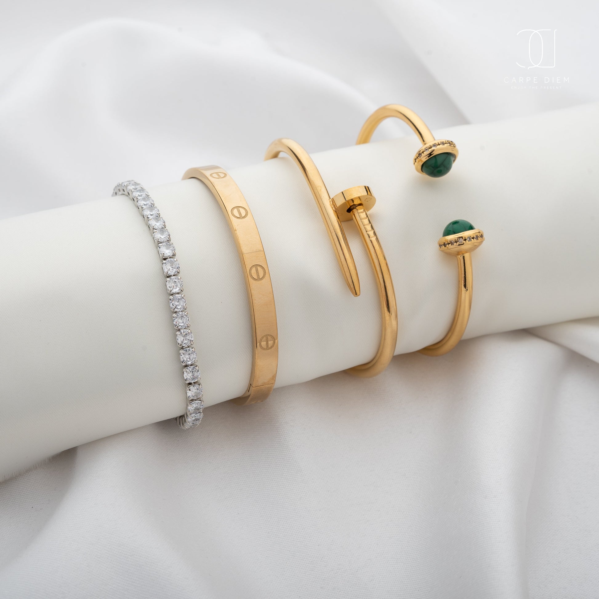 Description: A set contains gold cartier bracelet, gold nail bracelet, Tennis bracelet and green bracelet