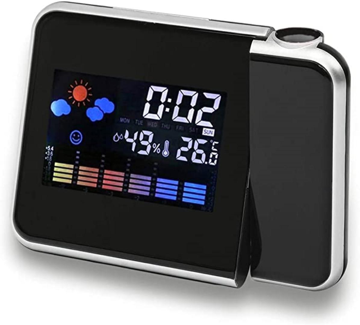 The alarm clock has a projector that displays the time on the wall or ceiling in addition to its bright colored screen that displays the time, date, temperature and humidity ??